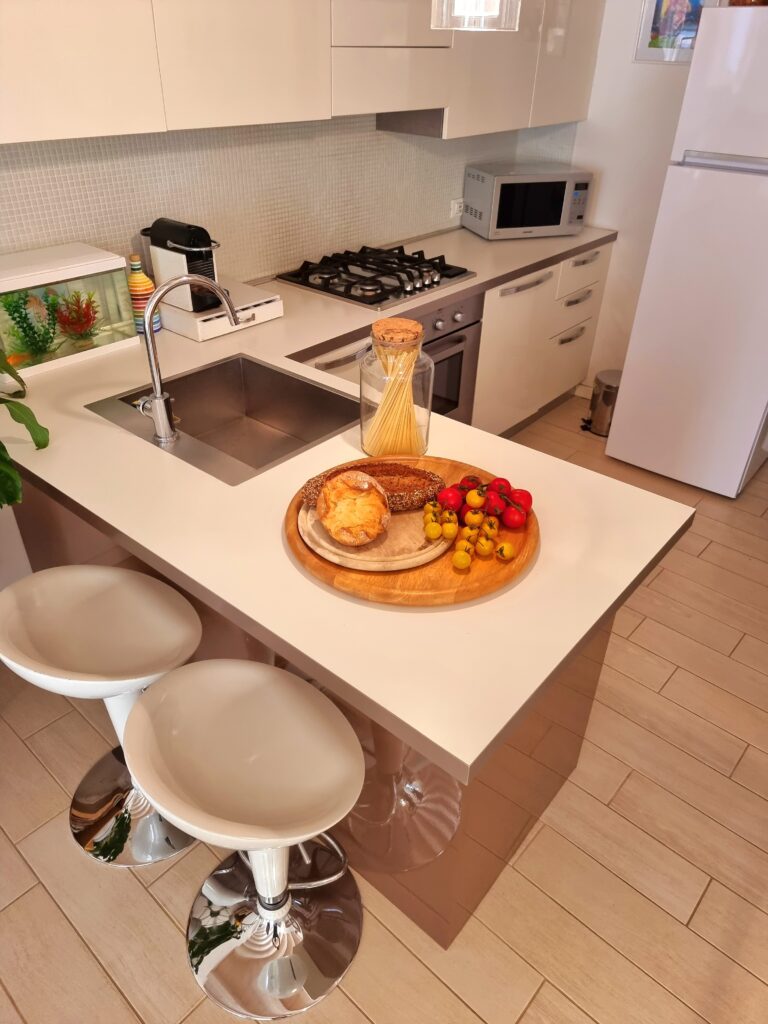 Il grande bagno è dotato di una doccia spaziosa e di tutti gli accessori necessari per un soggiorno rilassante. La sala cucina è un ambiente arioso e luminoso, completamente attrezzato con elettrodomestici di ultima generazione, ideale per preparare deliziosi pasti come a casa.