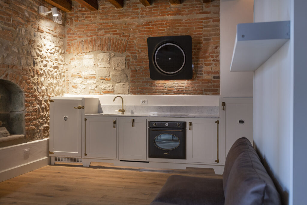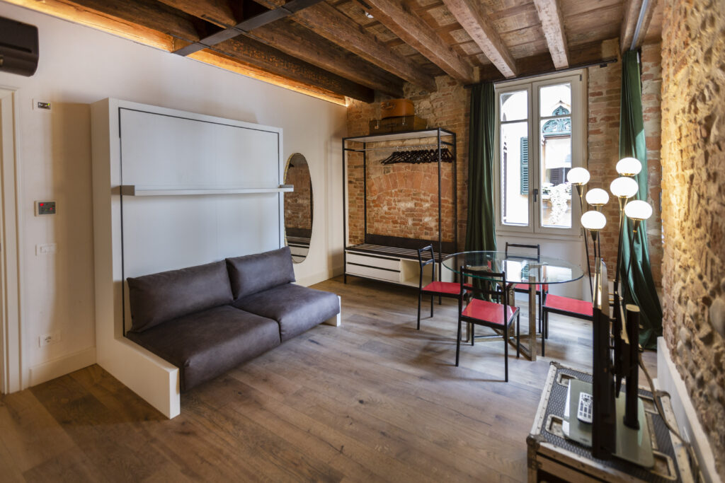 Ampio soggiorno con letto a scomparsa (160×200), cucina e bagno con ampia doccia.