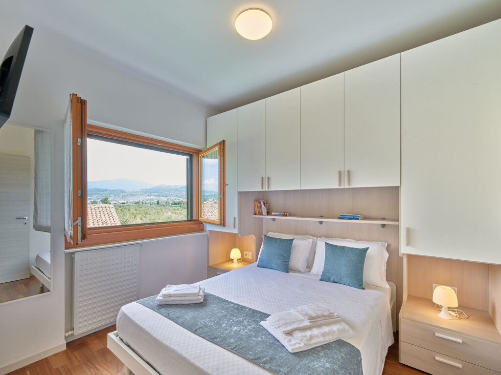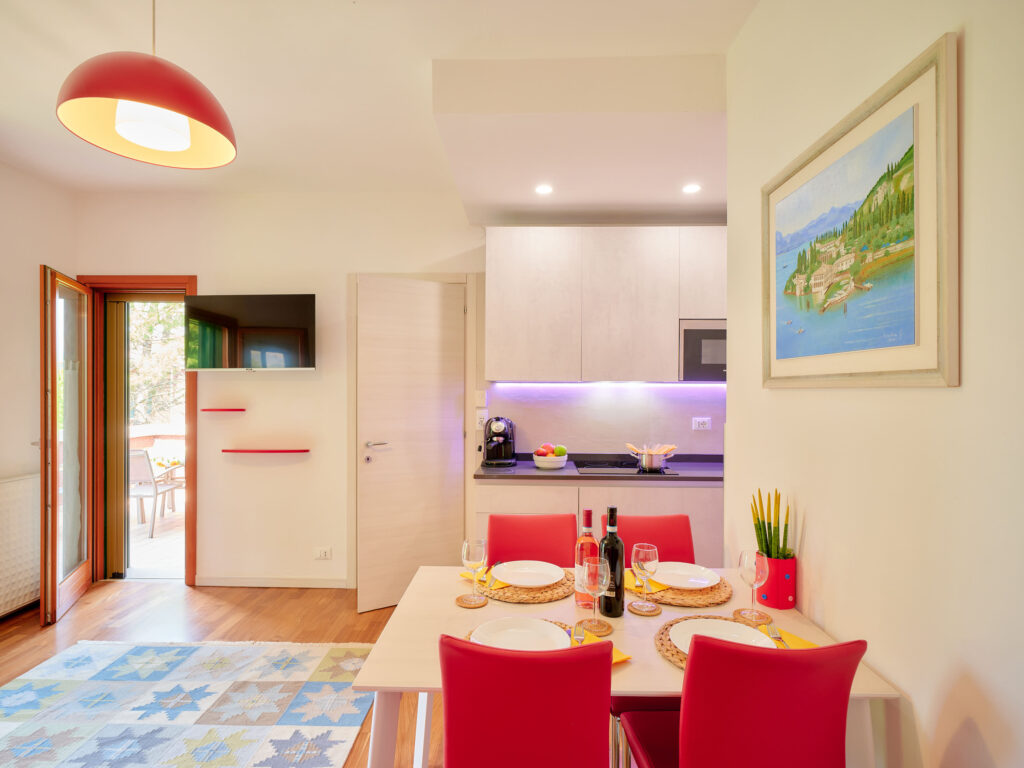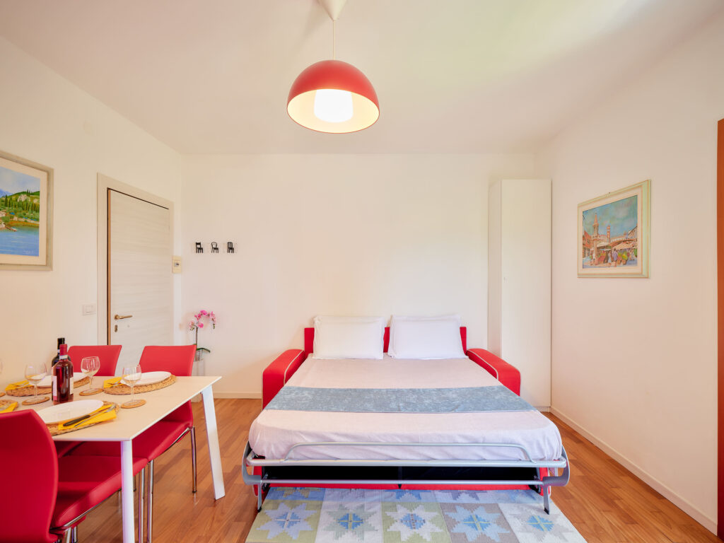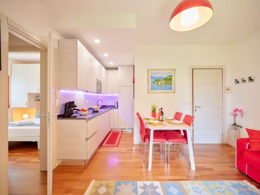 L’appartamento è composto da zona living con Cucina e Divano letto doppio con materasso alto 17 cm, Bagno finestrato con Doccia, Camera Matrimoniale, Terrazza con bellissima vista lago dotata di tavolo e sedie dove potrete fare colazione, pranzare e cenare.