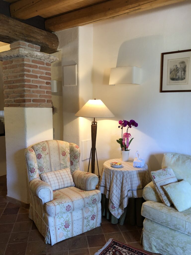 Soggiorno con comodi divani e con porta diretta che accede all’esterno direttamente al grande patio coperto accessoriato con tavoli e sedie per poter stare fuori all’aperto anche in caso di pioggia .
